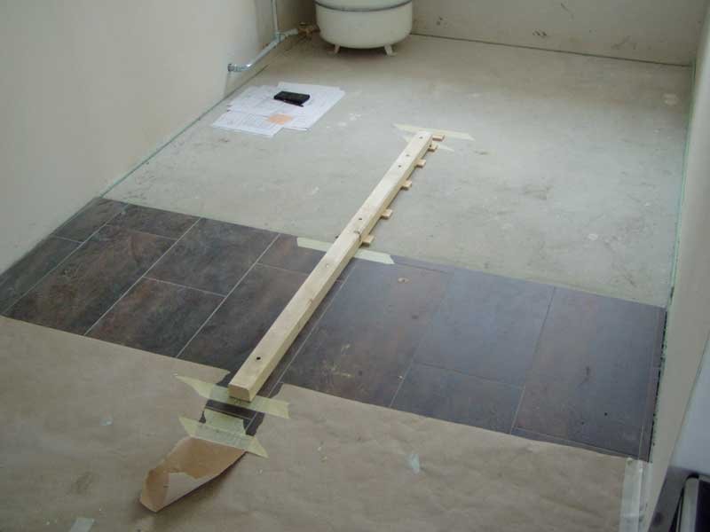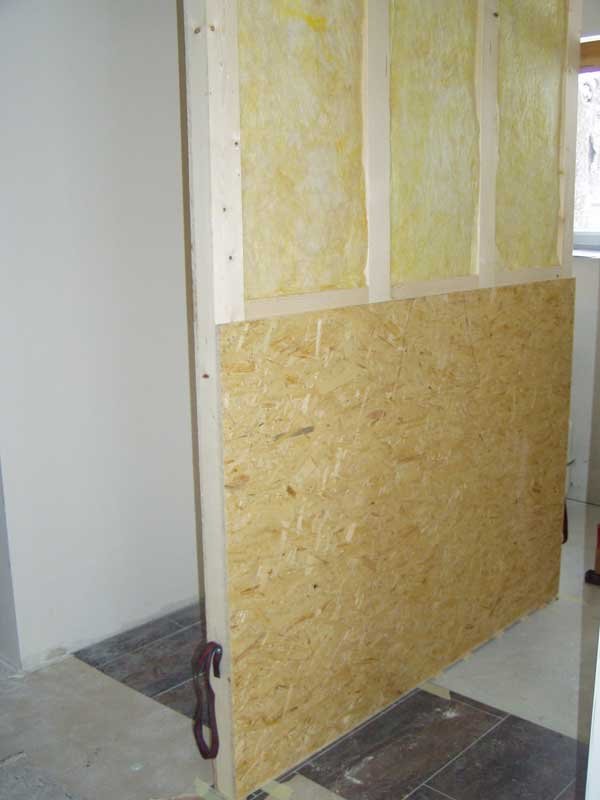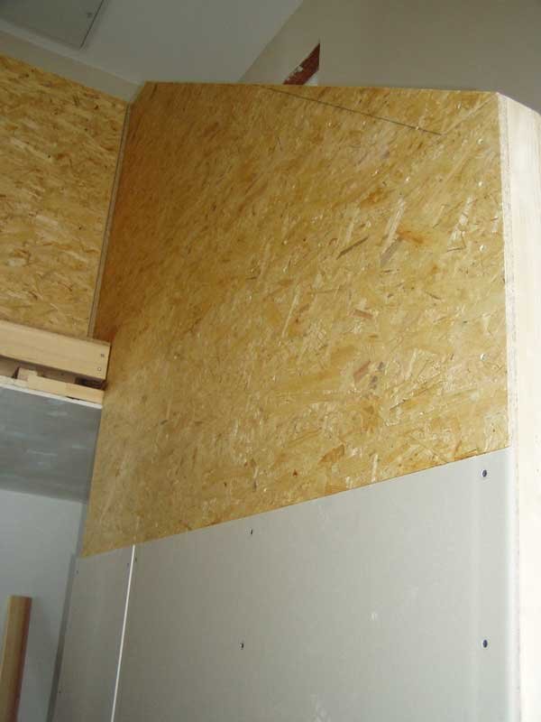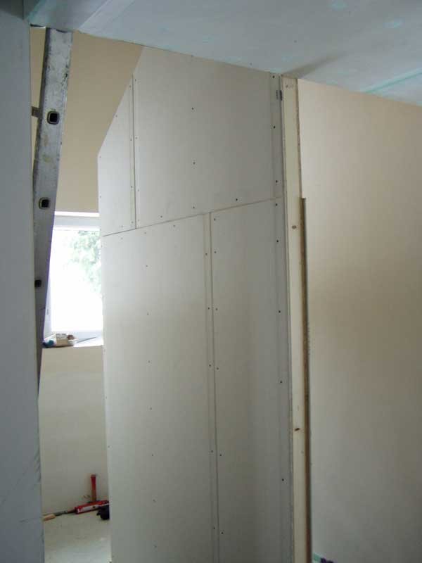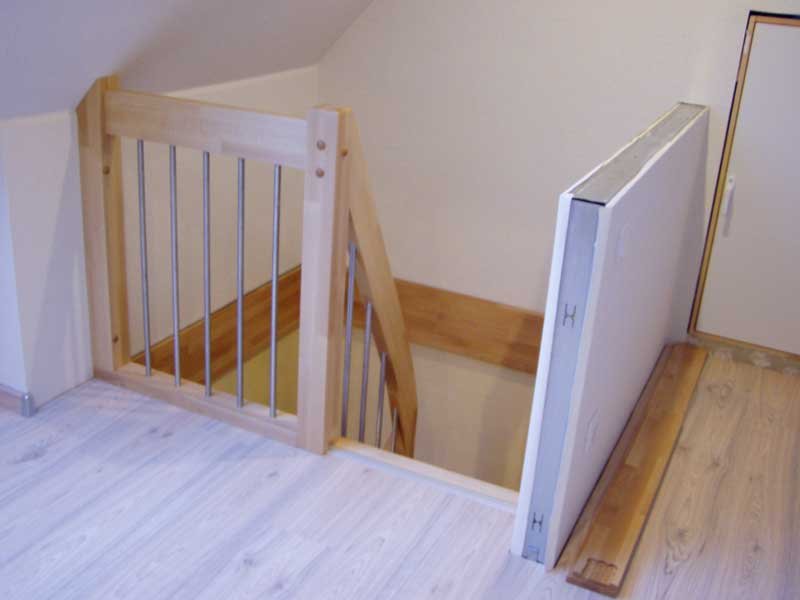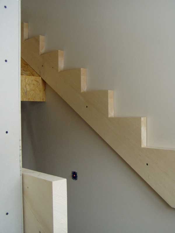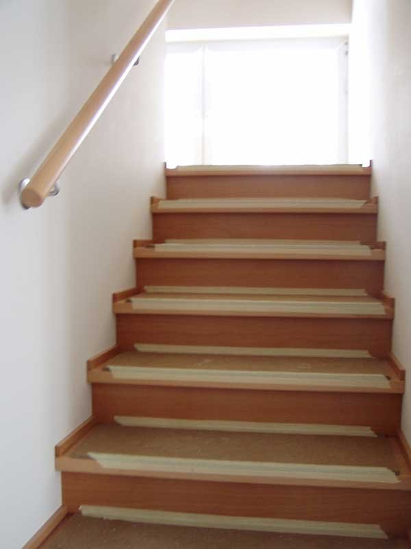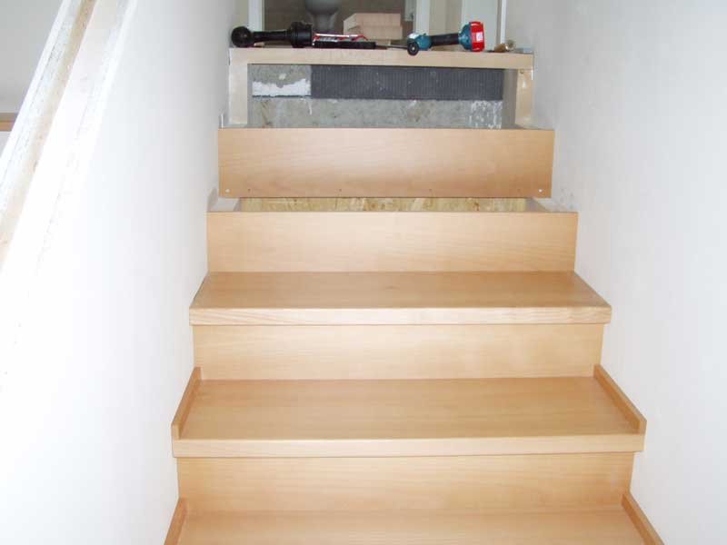 Aufbau einer Podesttreppe aus Buche mit Treppenlauf teilender Leichtbauwand und eingepasster Garderobe.