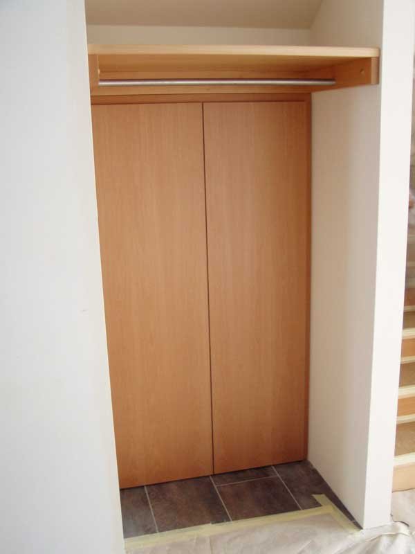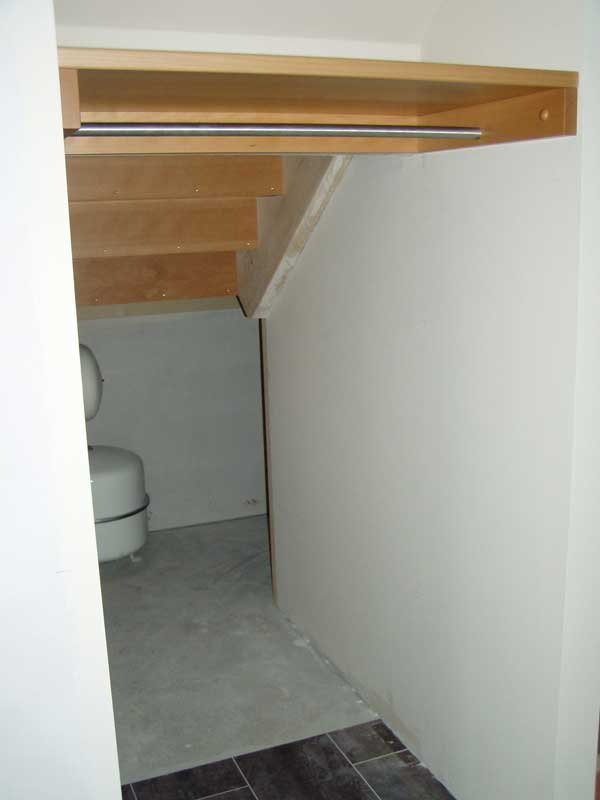 Die Rückwand der Garderobe besteht aus zwei eingepassten Türen, um den Raum unter der Treppe voll auszunutzen.